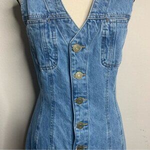 A modern twist on classic denim with a structured, tailored silhouette. This dress offers the perfect balance of sustainability, structure, and laid-back appeal. Inspired by the iconic trucker jacket, it features a sleeveless design and vintage-inspired utility chest pockets, giving it a casual, borrowed-from-the-boys vibe with a feminine mini-length cut. The deep V-neckline and gold-tone button front closure add a touch of sophistication. The mini hemline shows off the legs, while the straight shift-style silhouette offers a flattering fit without feeling overly tight or clingy.