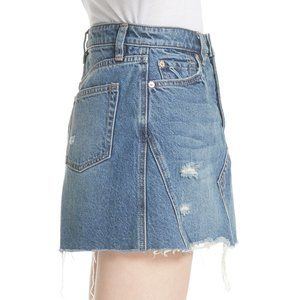 New with tags. A button fly puts a retro spin on this scuffed and shredded denim miniskirt cut in a sweet and sassy A-line silhouette. Size 25 = 0.