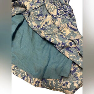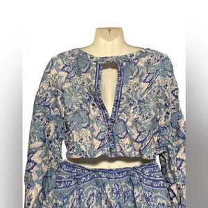 Free People Silver sun printed cutout long sleeve dress in washed blue. Perfect for the beach! This lightweight dress is going to be your fave! Button open back, elastic waistband, boatneck cut collar, and flowy, breezy