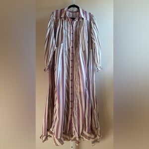Beautiful and billowy, this laidback dress features a striped cotton fabrication and shapeless silhouette with button closures and ruffled trim.