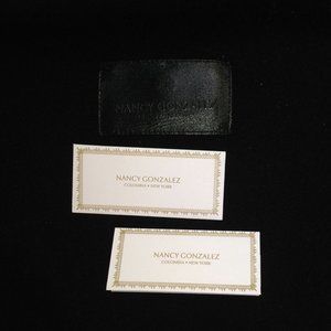 On the small zippered pocket, a matching crocodile patch reads "NANCY GONZALEZ" then on the line below "COLOMBIA . NEW YORK" (Photo #7). On the open patch pocket, the crocodile skin tag reads "GENUINE CROCODILE" then on then on the next line "MADE IN COLOMBIA" (Picture #8). The black flannel dustbag + authenticity cards are shown in Photos #9-10.