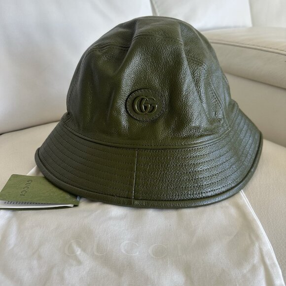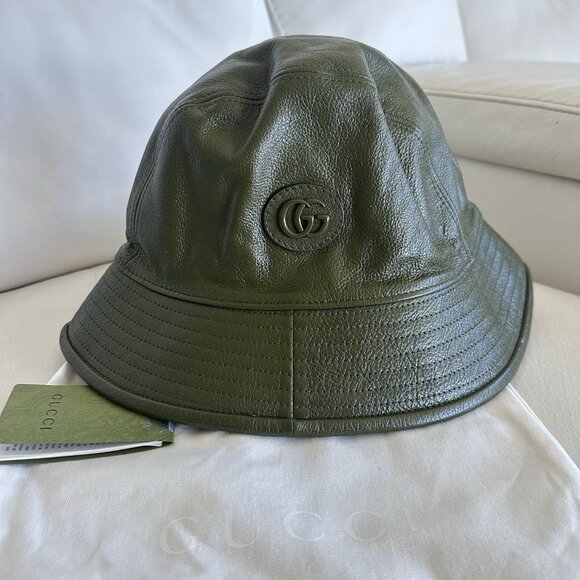 NWT Gucci Leather Double G Bucket Hat Dark Green 100% Authentic Sz S