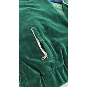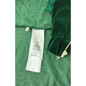 The Gucci Bi-material Scarf Print Track Jacket in Green is crafted from velvet and silk in Italy. This bi-material track jacket has an oversized construction and features a green velvet build, silk sleeves patterned with horse-bits and diamonds, a front zip closure, and pointed collar.