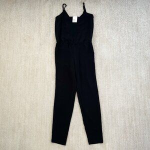 A black spaghetti strap jumpsuit with sheer mesh plunge front panel, elastic waistband, and pockets. Fabric doesn't really have stretch