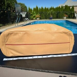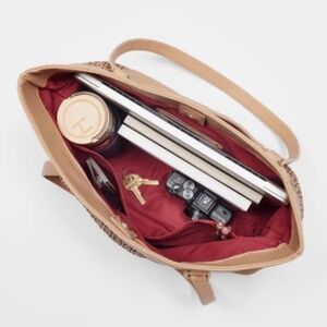 Brushed gold hardware, magnetic snap closure, flat comfort handles with O ring attachments, and a flat back pocket.