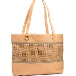 Andersen tote is crafted with smooth tan leather, muted warm green canvas with golden undertones and a lattice pattern.