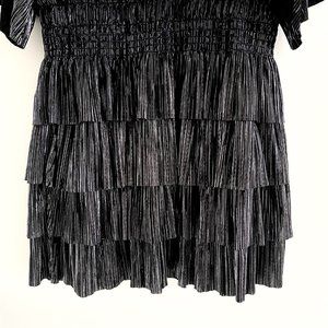 This stunning IRO Paris Cuzco mini dress features black and silver shimmering plissé pleating, a tiered-ruffle skirt and a blouson top. With a keyhole fastening at the back and an elastic waist. This is the perfect party dress and can be paired with heels for a chic look, or boots for a rock & roll vibe. Size is an FR 36 (translates to a US 4 or small). New with tags.