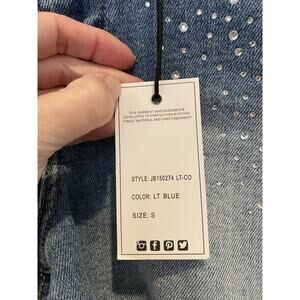 This is a pair of NWT Judy Blue Jean Shorts in size small with a high waist and a solid blue color. The shorts feature rhinestone accents on the front, along with a button closure and a zipper.