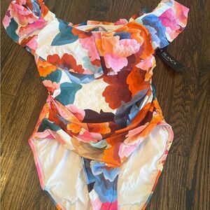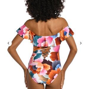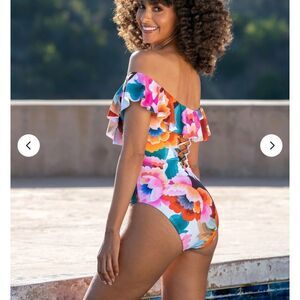 This one piece features romantice ruffles, a slimming shirred waist, lace-up back detail, removable cups, and moderate rear coverage.