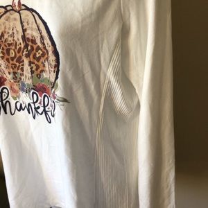 modern canvas cream sweater pumpkin thankful shirt, size XL, long sleeves, stretchy and comfortable, no trades