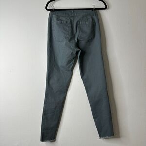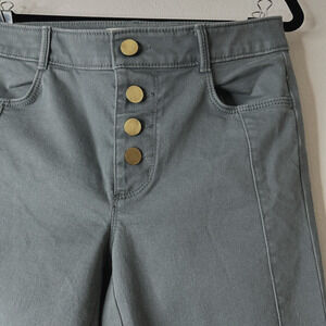 Loft Slate Gray Button Fly Frayed Hem Pants Jeans Front Seam running along thigh with Gold Buttons