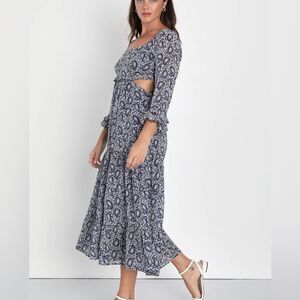 NWT Lulus Navy Blue Paisley Tiered Cutout Midi Dress women's size small