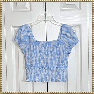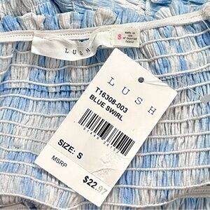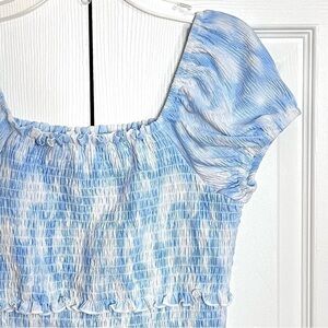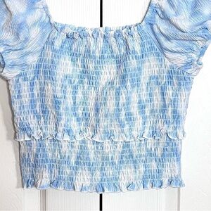 NWT Lush Blue White Tie Dye Elastic Ruffle Cap Sleeve Crop Top Size Small