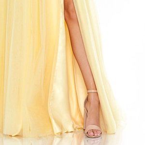 To satisfy your princess dress dreams, we designed this incredible gown with breathtaking detail, a frothy tulle skirt, and a sheer bodice. The A-line gown opens with a floral-embroidered and rhinestone-trimmed top beautifully made with built-in cups and a low back. The skirt is lined in decadent satin and cut with a slit for an extra peek of skin.