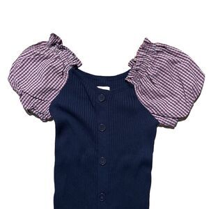 This NWT Maeve Anthropologie sweater dress is a stylish choice featuring a plaid pattern in blue and a square neckline with puff sleeves. The mini length and ribbed texture add a touch of playful sophistication, while the button closure and button accents provide a classic look. Made of 100% cotton knit fabric, this dress is perfect for various occasions such as travel, parties, or casual outings, offering a colorful and classic style with a hint of stretch for comfort.