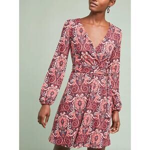 Anthropologie paisley dress, Maeve long sleeve dress, belted paisley mini, fall event dress, Anthropologie NWT dress, long sleeve wrap dress, shimmer fall dress, Thanksgiving outfit idea, Anthropologie party dress, burgundy paisley mini dress