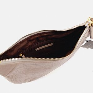 - Made of a leather exterior. -New with tag - Printed nylon lining. - Measures approx 11.5" W x 8" H x 1" D - Adjustable shoulder strap. - Zip top closure. - Interior zippered pocket. - Interior slit pockets. - Decorative exterior zipper at base. mmj_cb_wu_zinc