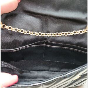 This is a beautiful black quilted crossbody bag from Nicole Miller. Bag is new with tags. The body of the bag is black with a quilted pattern on the front and top flap. The sides, back and bottom is black colored. The inside has card lots and sufficient room for the essentials for a night out. There is a gold chain that can be worn as a crossbody or shoulder bag.