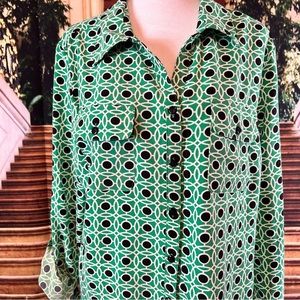 This Notations peacock shirt is green with a black and white circle pattern. Can be long sleeved, or sleeves can be rolled up and buttoned so the blouse has three quarter length sleeves. Two functional front pockets with black buttons. Six black buttons down the front, one on each cuff, and one on each side to button up sleeves. Has side slits. Approx. Measurements: Size: Large Back Length: 24.5" Arm Length: 23" Shoulder to Shoulder: 16.5" Armpit to Armpit: 21"