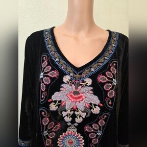 Add a touch of boho elegance to your wardrobe with this NWT Paparazzi long sleeve T-shirt. The V-neckline and embroidered accents make it a perfect choice for any occasion. Available in size XL, this regular fit top is suitable for women of all sizes. The black color adds a touch of sophistication, while the long sleeves make it perfect for colder days. Ideal for those who love to make a statement with their fashion choices, this top is a must-have for any stylish woman's wardrobe.