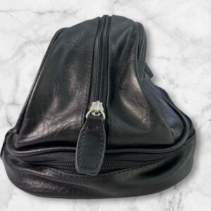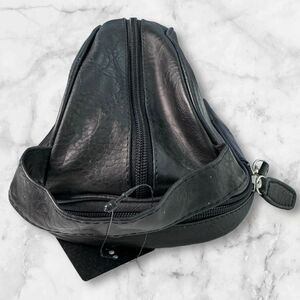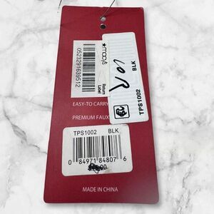 New with tags. Large interior compartment is lined to protect against spills. Bottom zipper compartment shown. Black faux leather.