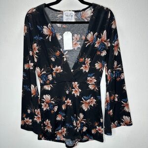 NWT Sadie & Sage Black With Peach Blue Floral Long Bell Sleeve Deep-V Romper S