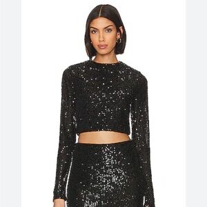 Introducing the Last Call Top - a burst of midnight glitz and style! This long sleeve top has an elastic neck and cropped hem. The ultimate party set paired with the All Night Skort, or styled with a high waisted black pant and oversized blazer.