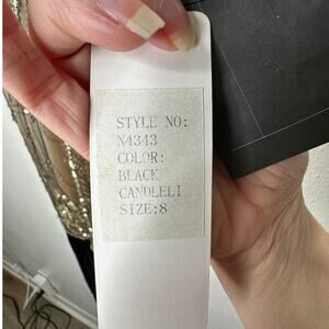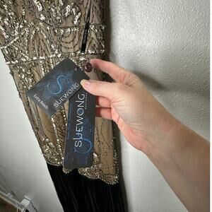 NWT Sue Wong Beaded Gold Mesh Top Black Fringe Bottom Evening Dress 8