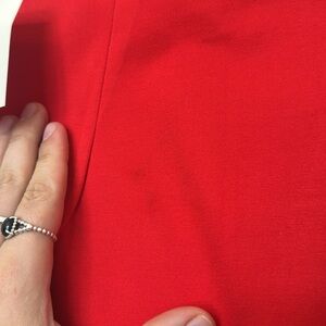 Zip on side. Exposed zipper detail. Cherry red color. Strapless and mini length