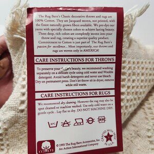 The Rug Barn "Colonial Hearts" throw is a rectangular-shaped non-standard size throw blanket made of 100% cotton in a natural cream color. This American-made blanket features a charming hearts pattern, fringed edges, and a Country style design. Measuring 46 inches in width and 67 inches in length, this cozy blanket is from the American Classics product line and is brand new with tags. Suitable for adults, this throw blanket can be machine washed, making it a practical and stylish addition to any room in your home.