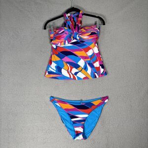 Swimsuit, Tankini, Bikini, Set, Two Piece, Convertible, Bandeau, Halter, Strapless, Low Rise, Multicolor, Vibrant, Colorful, Bold, Abstract, Psychedelic, Wavy, Swimwear, Resort Wear, Vacation, Cruise, Beach, Pool, Summer, Trendy, Retro, Fun, Spandex, Nylon, Stretchy.