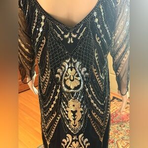 The product is a stunning NWT Vision For Innovation Performance Dance Skirt Dress in black, silver, and gold sequin accents. This formal dress features a V-neckline, 3/4 sleeves with sheer material, and a knee-length design. It is made of polyester and includes a zipper closure for easy wear. Perfect for a dancer theme, this XL dress is lined and designed for hand wash care to maintain its quality. Made in China, this dress is a beautiful and eye-catching option for any special occasion.