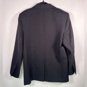 Blazer with lapel collar and long sleeves with shoulder pads. Faux Front flap pockets and welt pocket at chest. Back slit. Front button closure.