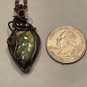 NWT DebbyTammy handmade Labradorite teardrop stone hand wrapped with copper wire. The Chain is base metal plated in antiqued copper. Stone is olive green with some touch of black veines. Tammy is a local jewelry Artist . She creates the most beautiful handmade wire wrapped jewelry using authentic crystals and stones. Every piece is one of a kind. When you wear Tammy’s handmade jewelry you are wearing an exclusive unique piece that will get many likes😊