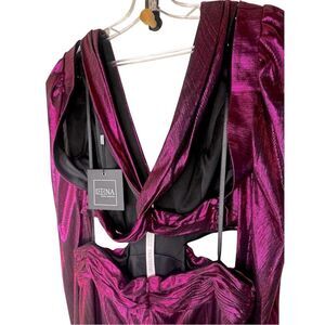 Elevate your style with this metallic gown. The metallic jersey fabric shimmers with elegance, while the draped bodice detail and side cutouts add a modern edge. The high low hem and thigh-high front slit provide a dramatic touch. Perfect for any special occasion.