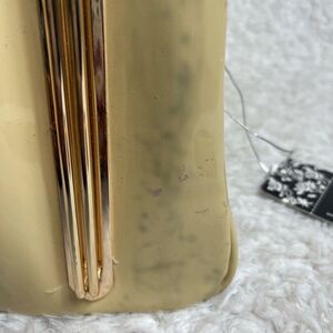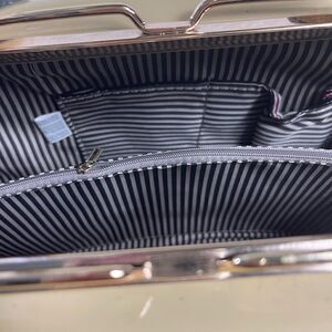 NWTLa Reine Patent Beige croc prints faux leather satchel gold tone frame accent double frame closure the inside lining has a middle zipper compartment,a side zipper and two side pockets.New but has some transfer marks that are not visible when wearing see all pictures any questions please message.