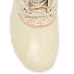 Stripes and woven geometric details adorn a waterproof duck boot with a modern color palette.
