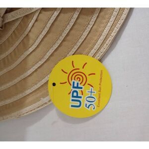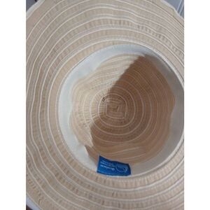 NWT wide brimmed Beach / sun hat. Straw like material with thin straw like ribbon two-tone design.has chin strap with toggle. Sun protection SPF 50. Maker is headwear..
