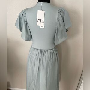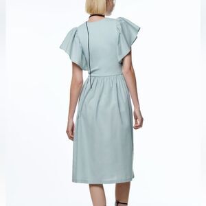 Round neck dress with short ruffled sleeves. Tonal matching fabric detail. Elastic waist. Light green color. *Brand new with tags. Authentic brand