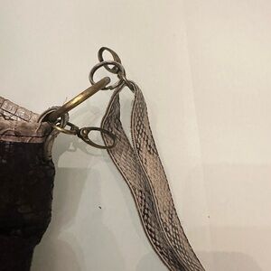 Features grey and black snakeskin design, two flat internal pockets and one internal zipper pocket, adjustable crossbody strap.