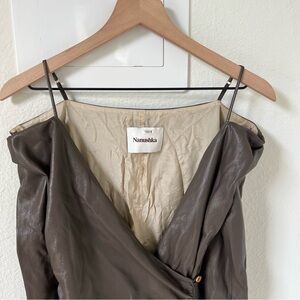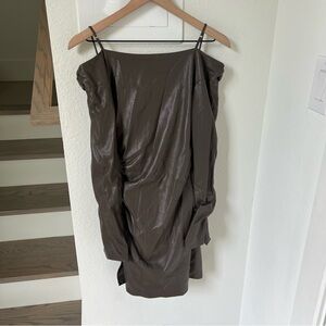 Nanushka Moha Faux Leathet Long Sleeve Off the Shoulder Mini Dress in Brown