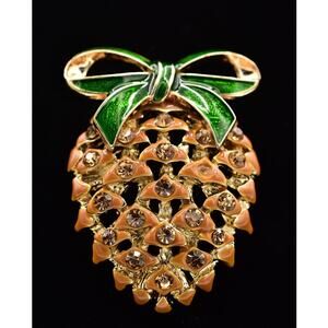 Napier Vintage Pine Cone Pin Brooch Crystal Enamel Gold Christmas Signed Bin4