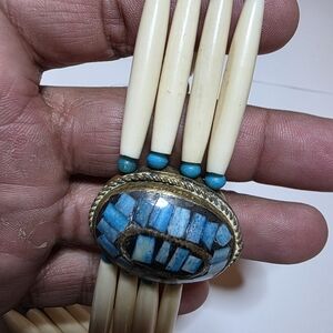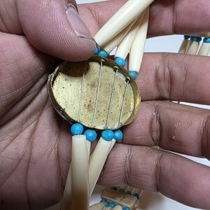 Native American Style Hair And Pipe Choker Necklace 15 Inches Long 4 Strand gold filled toggle clasp oval center faux turquoise chip inlay sold as is see pictures for reference