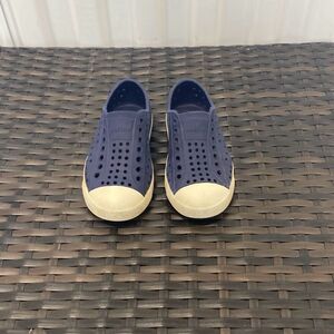 Native Jefferson kid size 9 the color is navy, blue and good preowned condition. Normal wear and tear dirty on the back of the heels and a little dirty on the tips of the toes. See pictures for more details also a little dirty around the white trim of the shoes still wearable still in great shape.