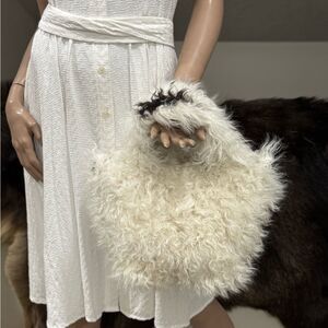 •Genuine shearling top handles strap, 4” drop