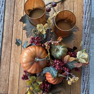 Natural looking berry, gourd, leaf and pumpkin arrangement mounted on a metal branch with leaves holding 2 glass candleholders. In VGUC.