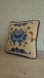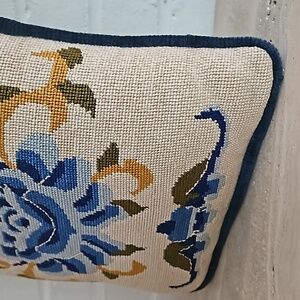 Beautiful Blue, cream, navy and green needlepoint throw pillow with floral motif. Navy velvet piping and cordoroy back with zipper.