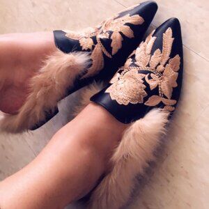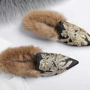 Ideal for transitional weather and effortlessly styled with jeans, tailored pants, or dresses, these embroidered fur slides are your go-to fashion statement for fall, winter, or beyond. Their sleek black finish and detailed craftsmanship make them a standout in any wardrobe.