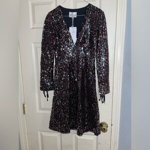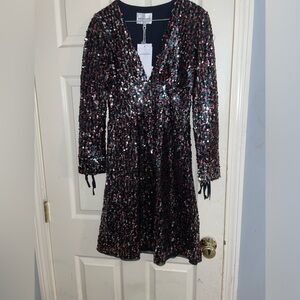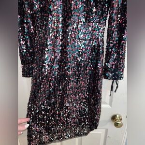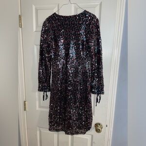 This dress is absolutely stunning and sold out!!! This is such a beautiful, well made dress, perfect for any upcoming celebration or event!! The intricate sequin detail is everything and the luxe detailing doesn’t disappoint- check out the lace up sleeve detail!          This dress is fully lined, with heavily hand-sequined design, its pleated hem line is so flattering and the lace up detail on the sleeves is beautiful!