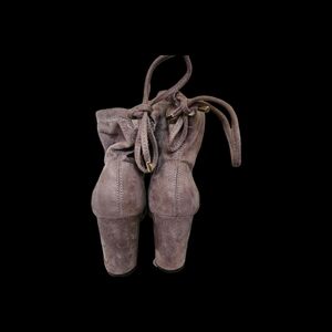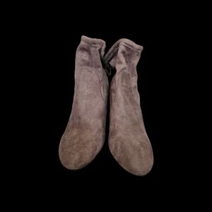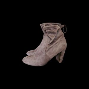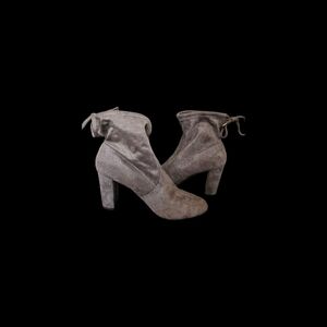 New Directions Hollis Booties. Size: 8. Fabric Upper: Balance man made materials. Soft suede-like material outside. Excellent condition (had to choosegood becausethere'sno Excellentlisted). Beautiful booties. Lightly worn. Dark taupe. Back ties with gold tips.